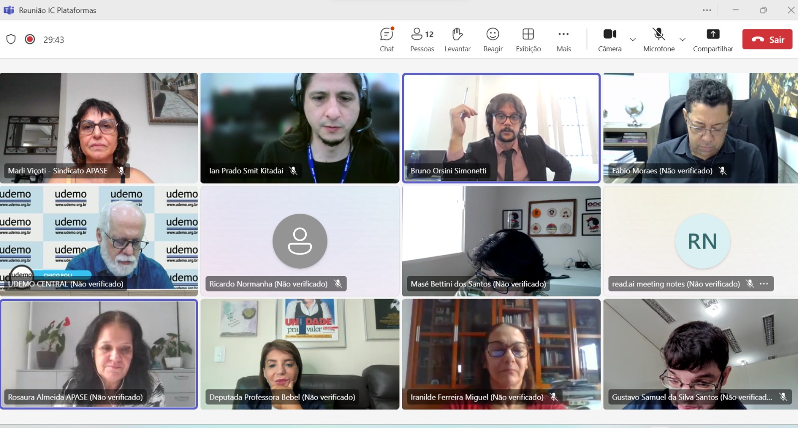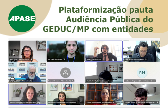 O Grupo de Atuação Especial de Educação – GEDUC/Ministério Público e a Defensoria Pública do Estado de São Paulo promovem Audiência Pública virtual, nesta tarde, dia 16/04/2025, com o Sindicato-APASE, demais entidades da educação e o Comitê SP pela Campanha Nacional pelo Direito à Educação, sobre a Plataformização do Ensino.